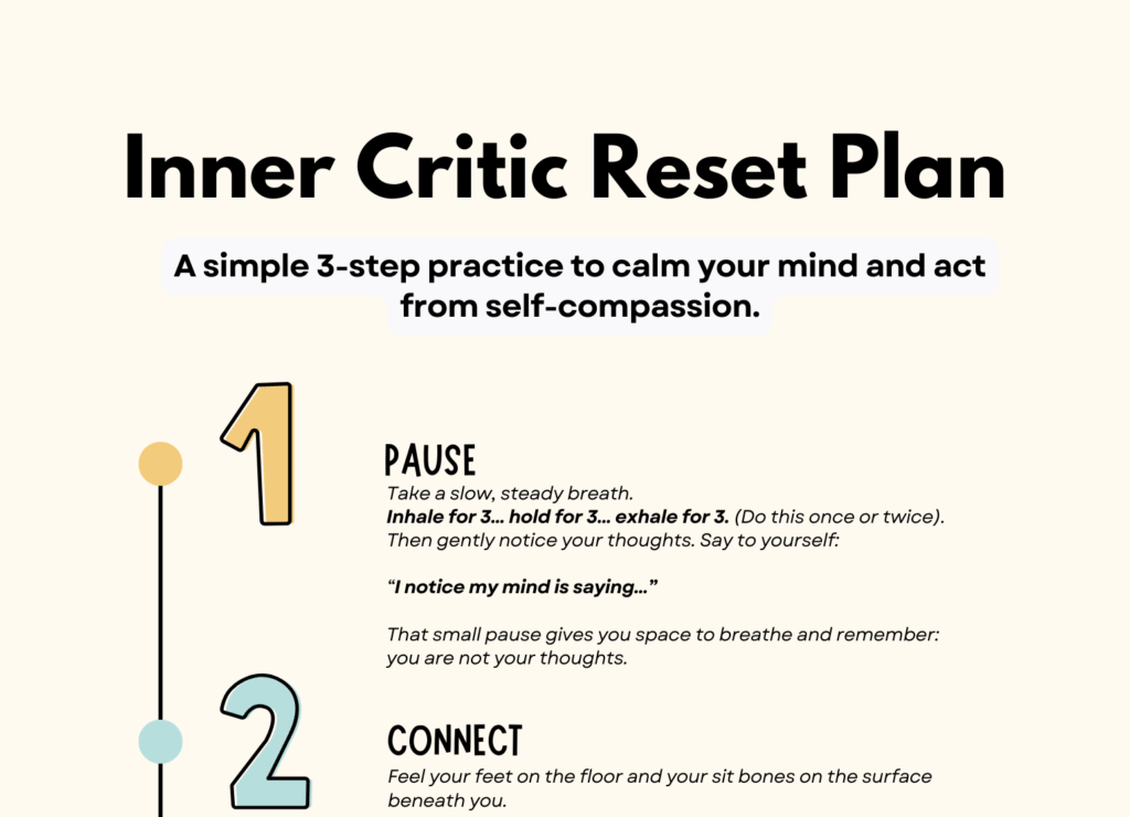 During these spirals, it’s crucial to have a gentle reminder that grounds you in the present. That’s why I created the Inner Critic Reset Cheat sheet. It’s a quick guide you can use when you feel stuck in self-criticism. It walks you through what to do in the moment so you can pause, reconnect with yourself, and take the next step from a calmer place.